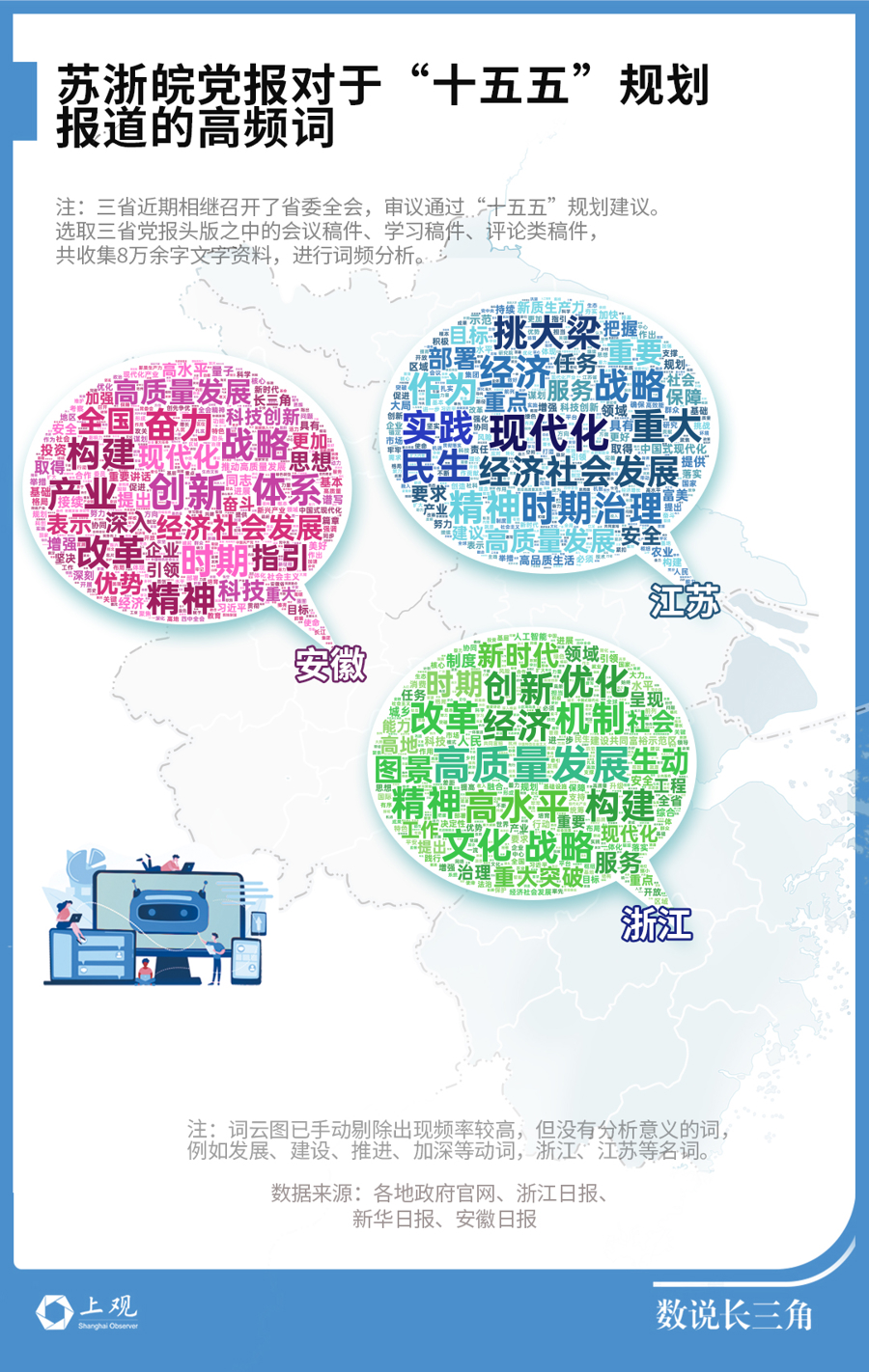 近期,江苏、浙江、安徽三省省委陆续召开全会,审议并通过了各自的“十五五”规划建议。三省均紧扣中央精神、紧扣重点工作、紧扣民生需求,锚定中国式现代化目标,立足自身禀赋,在战略重点、发展路径上呈现差异化特色的同时,瞄准科技创新、扩大内需、文化建设等方面发力,推进一体化发展。